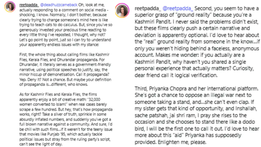 फिल्म और राजनीति के मेल पर एक बार फिर बहस तेज हो गई है। एक्ट्रेस अनीत पड्डा की बहन रीत के हालिया बयान ने सोशल मीडिया पर नया विवाद खड़ा कर दिया है। उन्होंने फिल्म धुरंधर 2 को लेकर तीखी टिप्पणी करते हुए इसे एक “प्रोपेगैंडा” फिल्म बताया, जिसके बाद यह मुद्दा तेजी से वायरल हो गया।